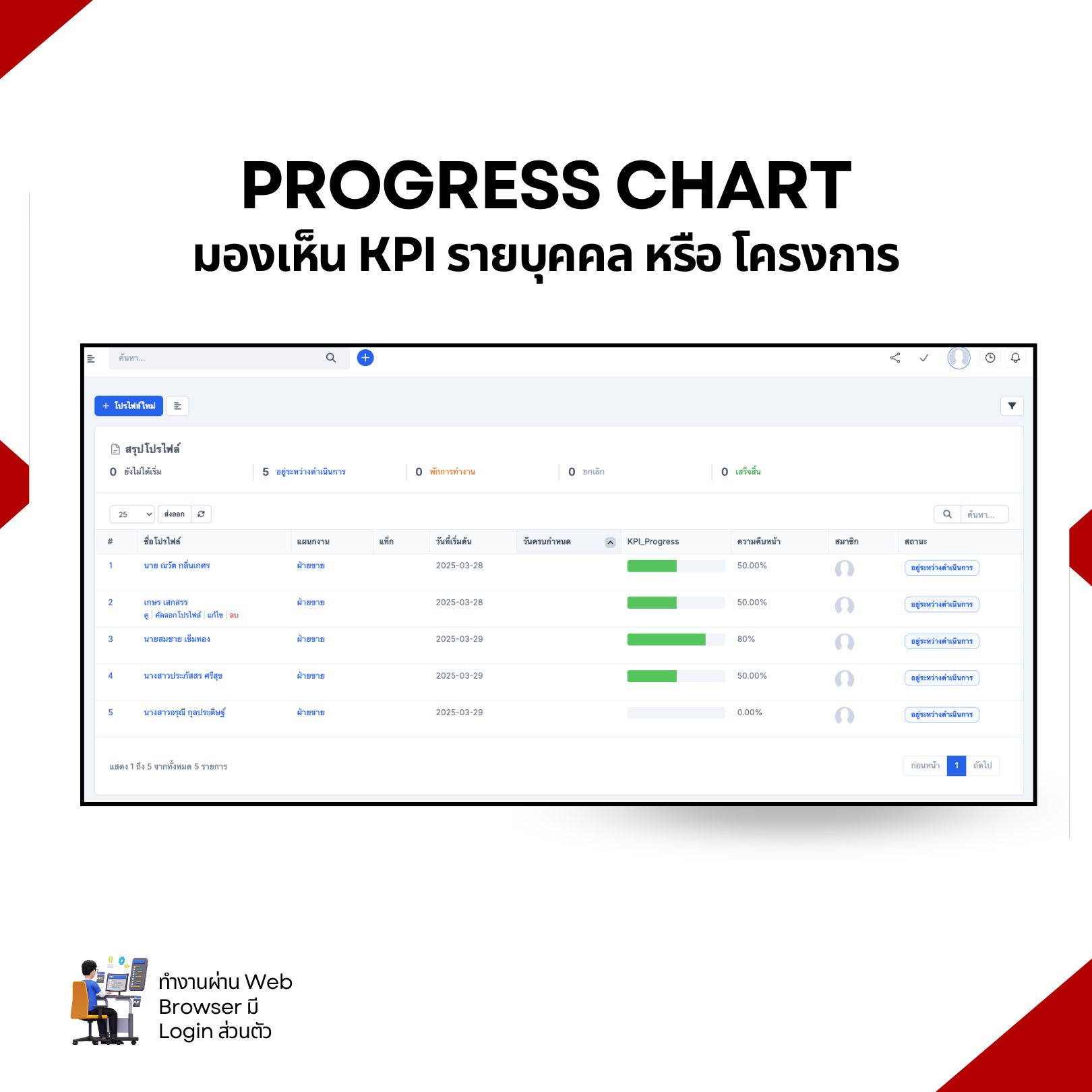 เหมาะสำหรับผู้ที่ต้องการติดตามความคืบหน้าของงานที่มอบหมายให้ทีม โดยระบบจะแสดงสถานะความก้าวหน้าของโครงการที่พนักงานคนนั้นๆ ได้รับมอบหมาย หลายองค์กรจะนำอัตราความสำเร็จของโครงการไปเทียบกับ KPI เพื่อประเมินประสิทธิภาพของทีมงาน เพื่อประเมินผลงานในระยะยาว